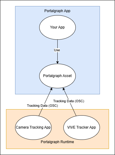 Portalgraphの視点トラッキングはPortalgraphアプリケーション本体から独立したソフトウェアとして実装されいていて、OSC経由でアプリケーションに座標を送信します。現在はWebカメラによるフェイストラッキングとVIVEトラッカーによるトラッキングに対応しています。