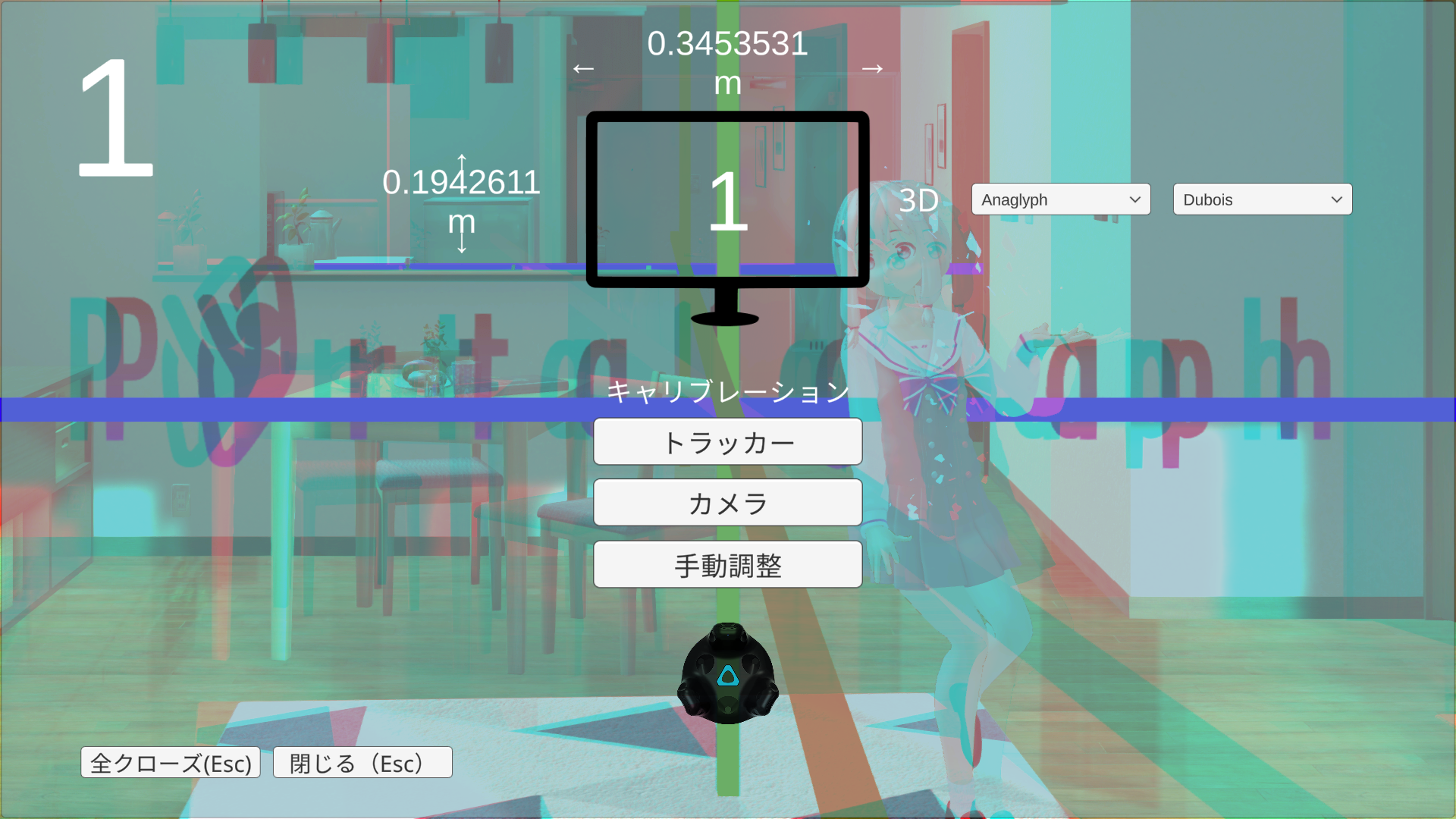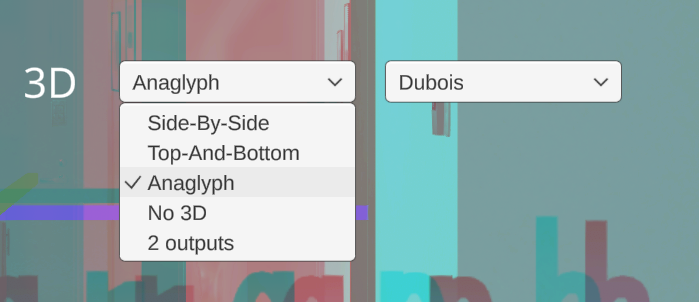 * Anaglyph・・・赤青3Dメガネ。右のドロップダウンから色の分割方式が選択できます。