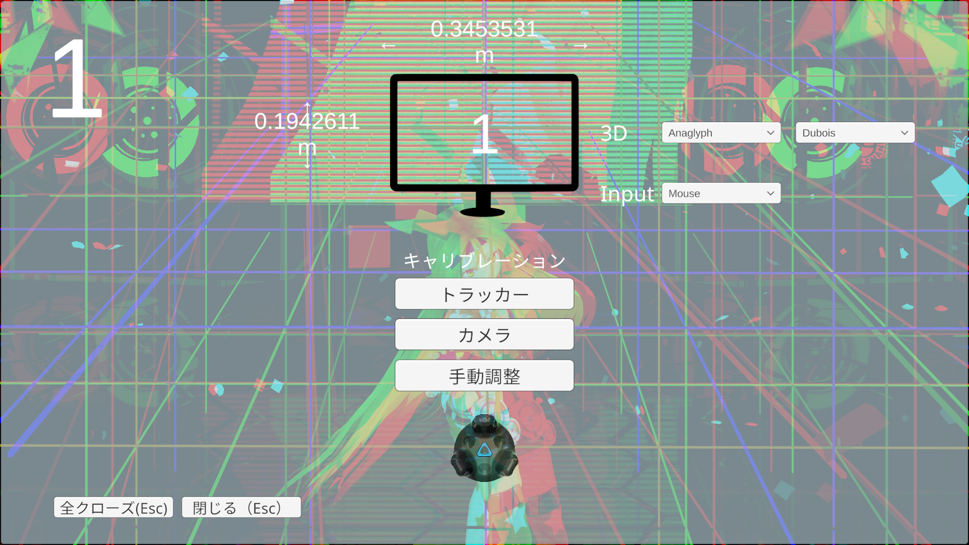 「閉じる」をクリックすると画面の中にユニティちゃんが現れるので、アナグリフ（赤青）メガネをかけると自由な角度からユニティちゃんが動いてるのが3Dで見られます。